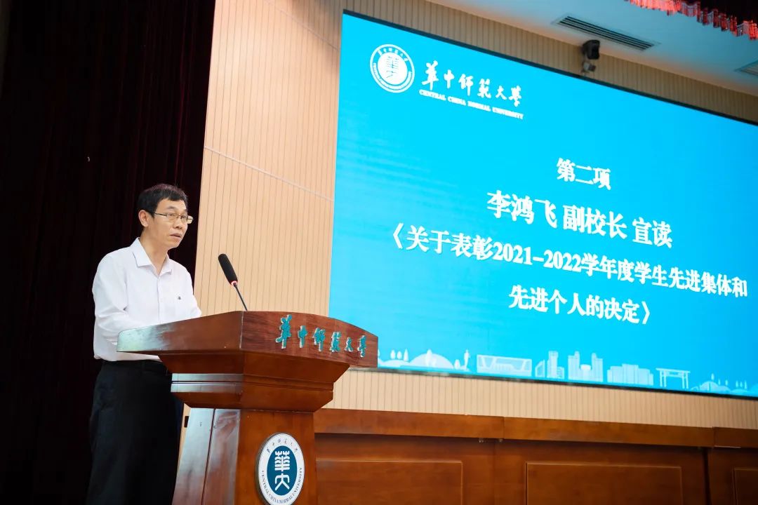 副校长李鸿飞宣读《关于表彰2021-2022学年度学生先进集体和先进个人的决定》