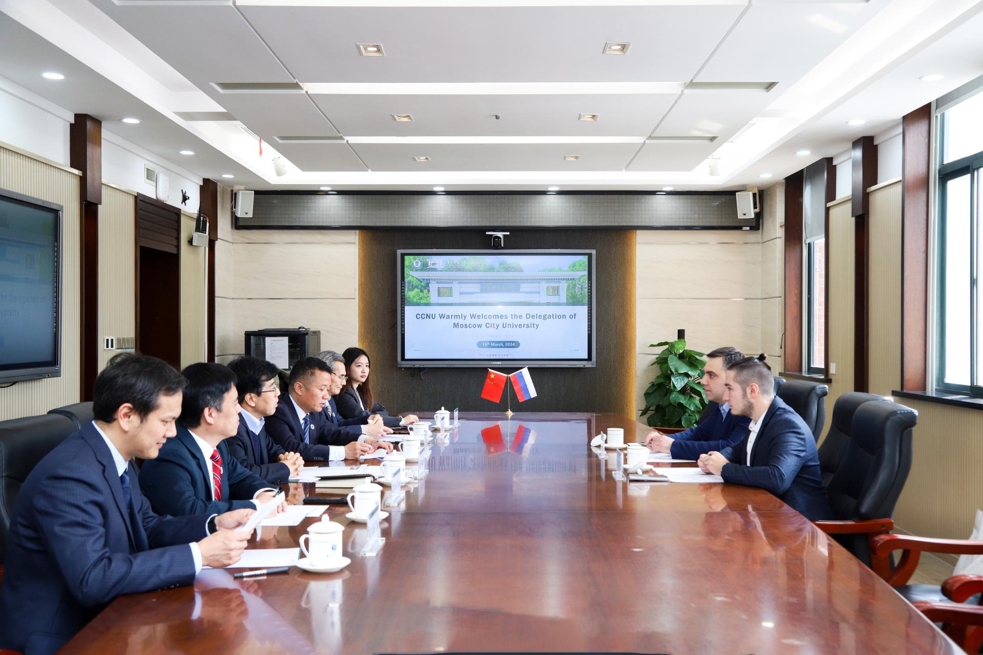 华大在线讯(通讯员 张芷珣)3月15日,莫斯科市立师范大学(以下简称“莫市师大”)副校长苏雷曼诺夫(R. C. Suleimanov)率团访问我校,校长彭双阶在行政楼三楼会议室会见代表团。人工智能教育学部、国际合作与交流处、国际文化交流学院相关负责人参加会见。