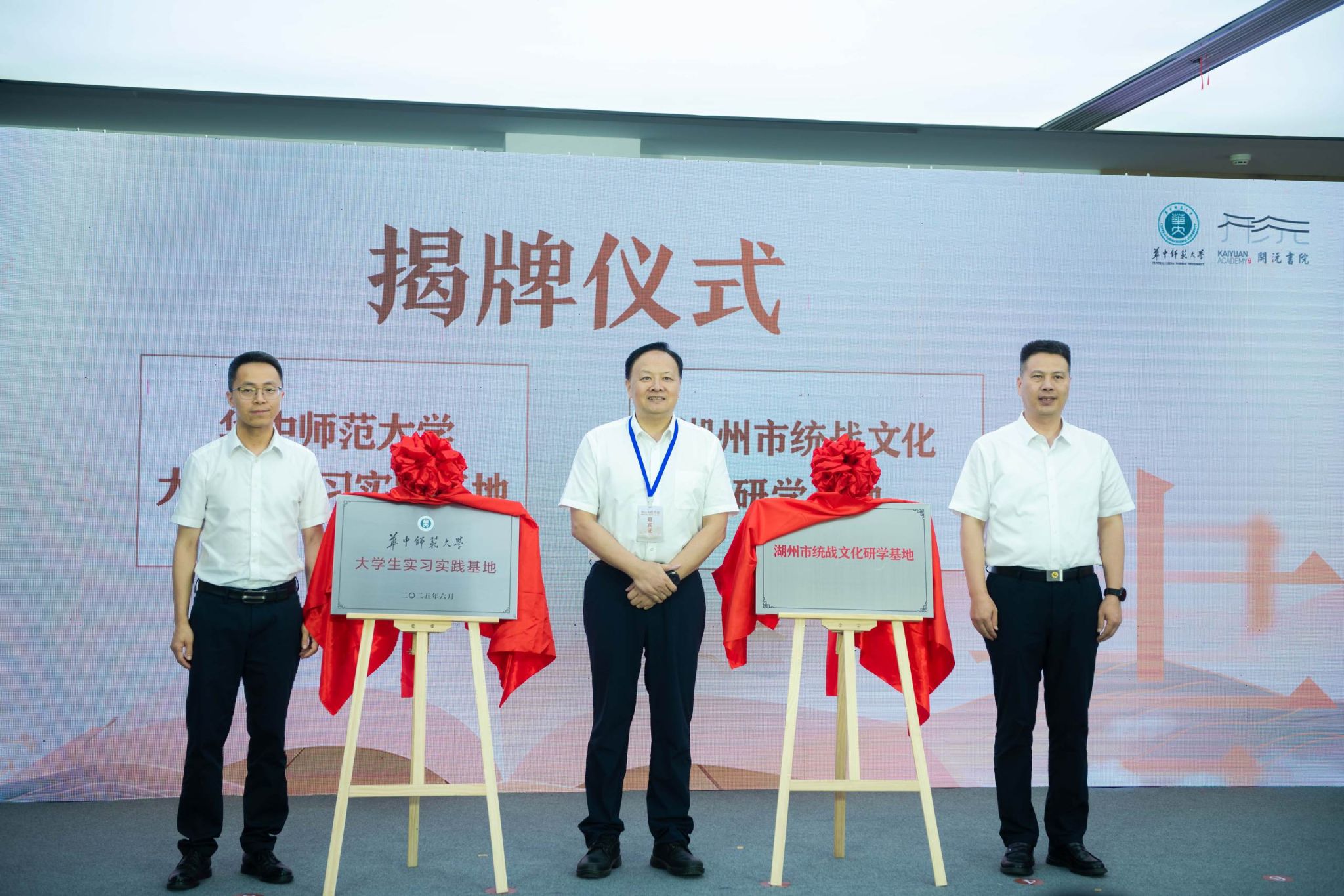 周鹏程、湖州市委统战部副部长吕昌等为我校大学生实习实践基地、湖州市统战文化研学基地揭牌