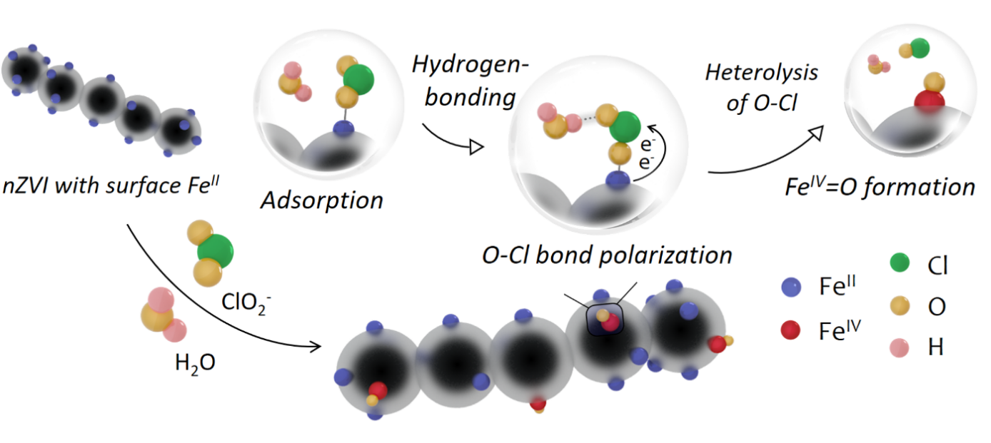 图为纳米零价铁与亚氯酸根选择性合成高价铁氧物种示意图