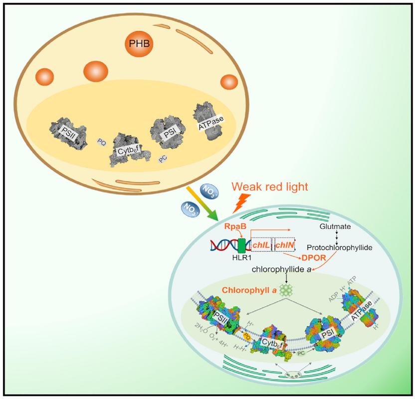 DPOR起源于早期地球无氧环境,由类固氮酶演化而来,在蓝藻和一些植物中与光依赖性原叶绿素内酯还原酶(LPOR)共同参与叶绿素的合成。LPOR则存在于所有有氧光合生物中,被公认为光合作用生物发生的早期开关。迄今为止,关于DPOR的生物学功能认识还很有限。本研究揭示了古老的DPOR对于蓝藻光合复苏过程中叶绿素的逐步积累十分关键,在弱红光的诱导下,DPOR催化叶绿素的合成犹如光合复苏的“星星之火”, 可以“燎原”细胞去黄化的光合作用复苏之势。该结果不仅为植物中DPOR的生物学功能提供了新的认识,也有助于我们更好地了解环境变化条件下光合机构的生物发生与调控机制。